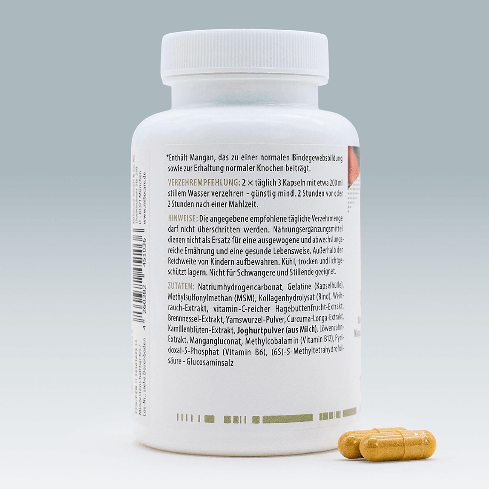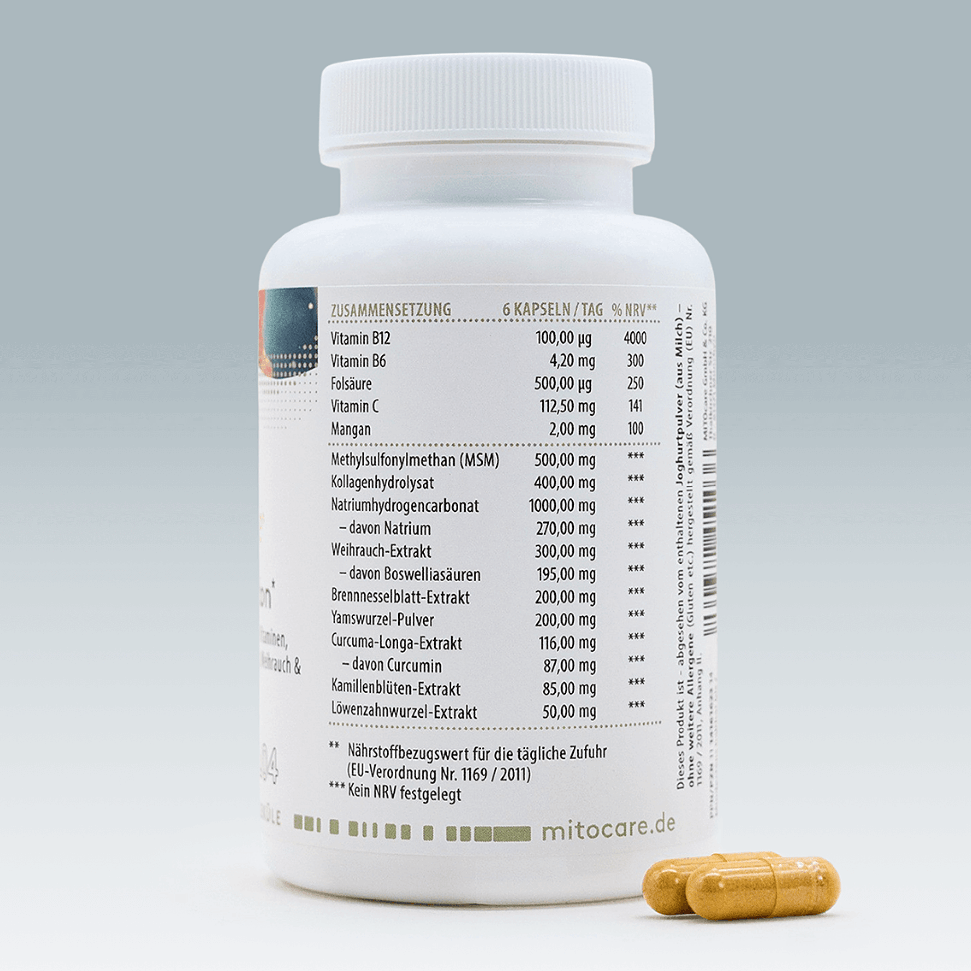 Zutaten: Natriumhydrogencarbonat, Gelatine (Kapselhülle, Gr.0, aus Rind), Methylsulfonylmethan (MSM), Kollagenhydrolysat (Rind), Weihrauch-Extrakt, vitamin-C-reicher Hagebuttenfrucht-Extrakt, Brennnesselblatt-Extrakt, Yamswurzel-Pulver, Curcuma-Longa-Extrakt, Kamillenblüten-Extrakt, Joghurtpulver (aus Milch), Löwenzahn-Extrakt, Mangangluconat, Methylcobalamin (Vitamin B12), Pyridoxal-5-Phosphat (Vitamin B6), (6S)-5-Methyltetrahydrofolsäure - Glucosaminsalz